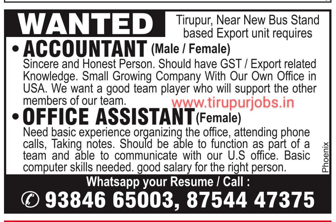 Today (23.11.2020) jOBS Openings in Tirupur exclusively